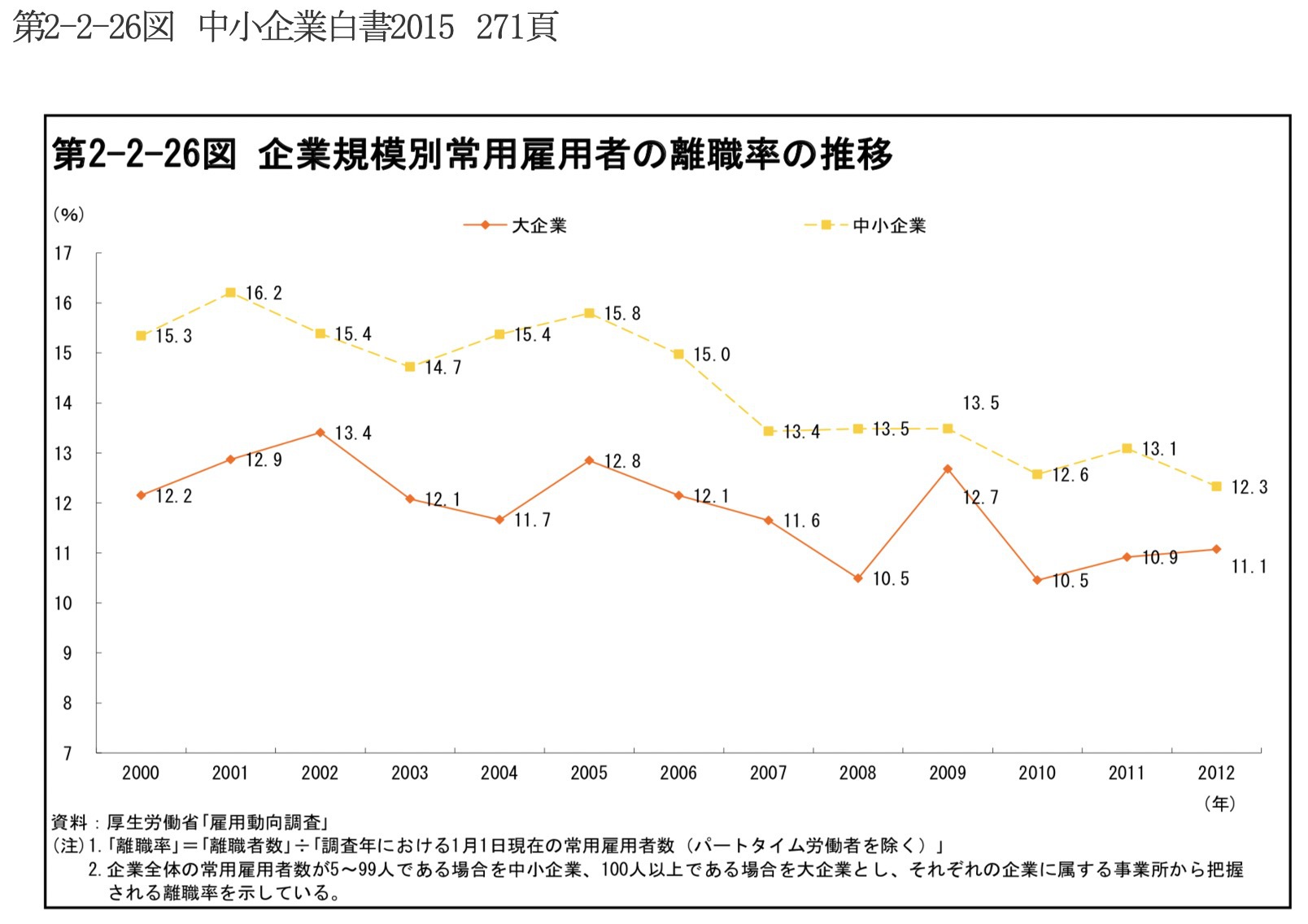 採用した者が、定着してくれるか否かは経営にも大きく影響する。白書271頁のグラフをみると、過去 12年間に大企業・中小企業ともに離職率はやや減少傾向にあるものの、常に中小企業の離職率は大企業を上回っている。グラフの最終年である2012年の中小企業の離職率は12.3%となっているが、 2001年の離職率は 16.2%である。また、その前後3年間は 15%を超えていることから、 3年で凡半分の社員が退社していると言える。このことは、やはり、3年で半数が退社してきた当社の過去の実態とも合致する数字である。