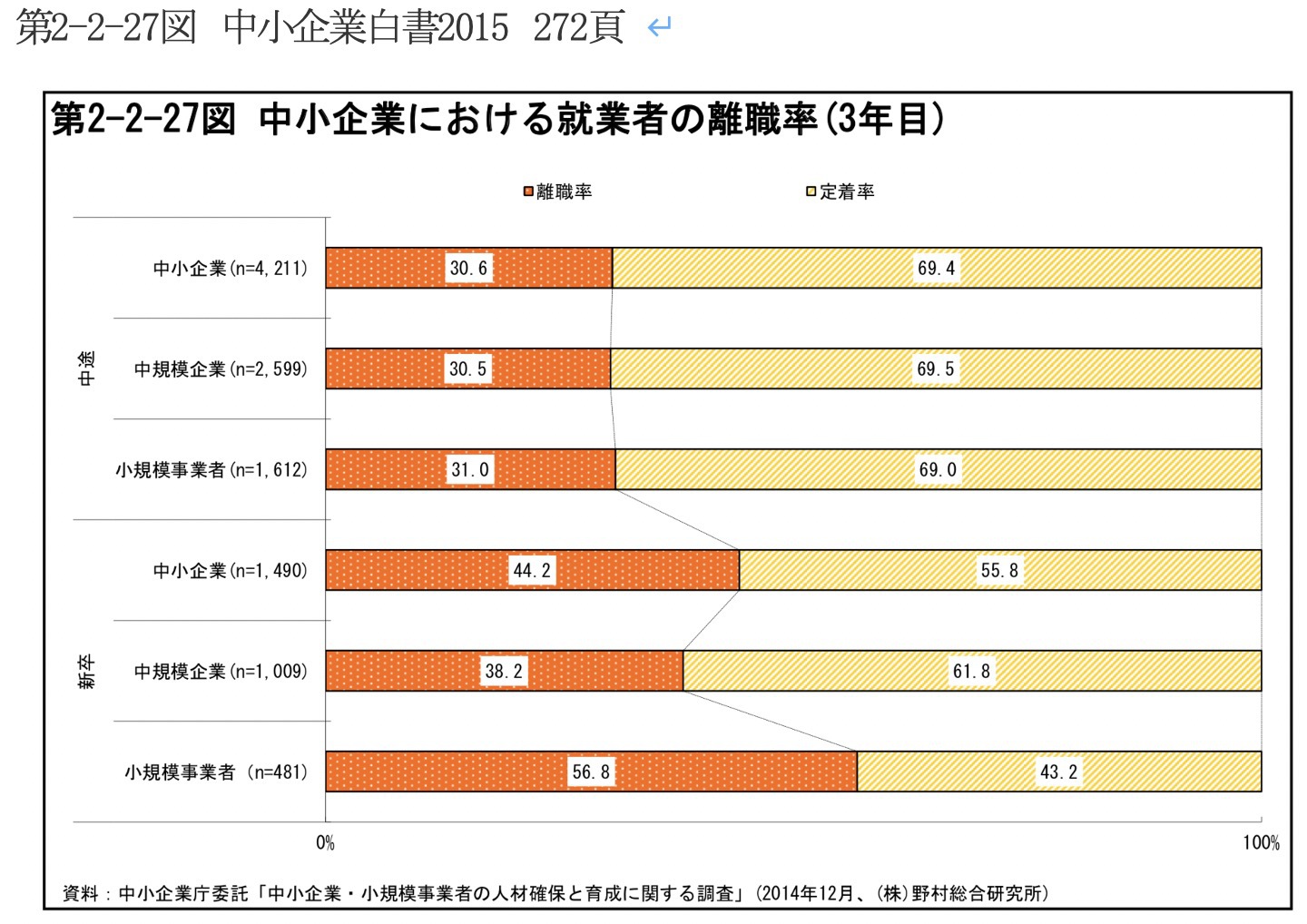データから、大企業との離職率の差が 2012年の数字では 1.2%である。ここでは、一見、離職率をみると大差がないように見えるが、実際には入社 3年以内に半数近くの者が退社する状況から、戦力になる前の育成段階で多くの者に退社されてしまうことが、中小企業の苦悩の1つなのである。