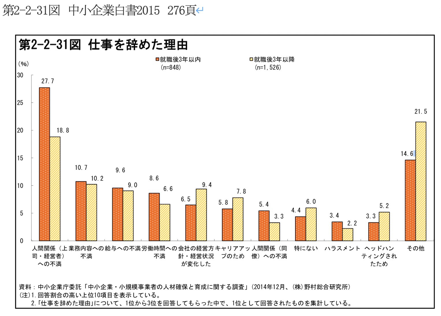 ここでの数字は、当社の過去の実態が特殊ではないことを物語っている。そして、白書が言うように、多くの中小企業にとって「人材を職場に安定的に定着させること」は大きな課題である。これからの人材確保は、採用活動だけに偏らず定着を課題にした活動も必須である。